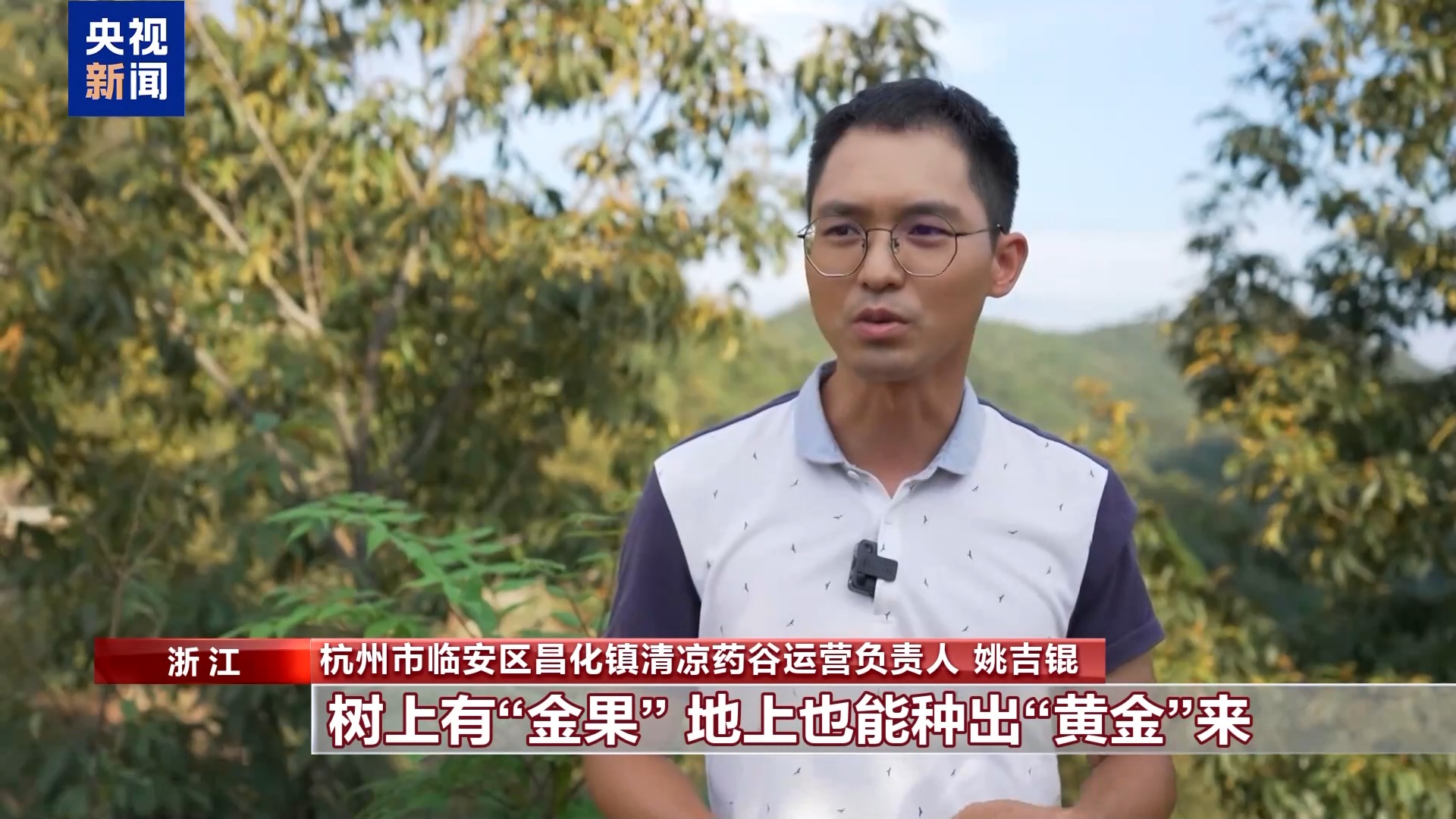杭州市临安区昌化镇清凉药谷运营负责人 姚吉锟:我们种的一些浅表品种的中草药,它的一些落叶、果实会堆积在表面,相当于自然环境中的营养。它们的根系在浅表稳固住沙土,水土流失也没有那么明显。树上有“金果”,地上也能种出“黄金”来。
